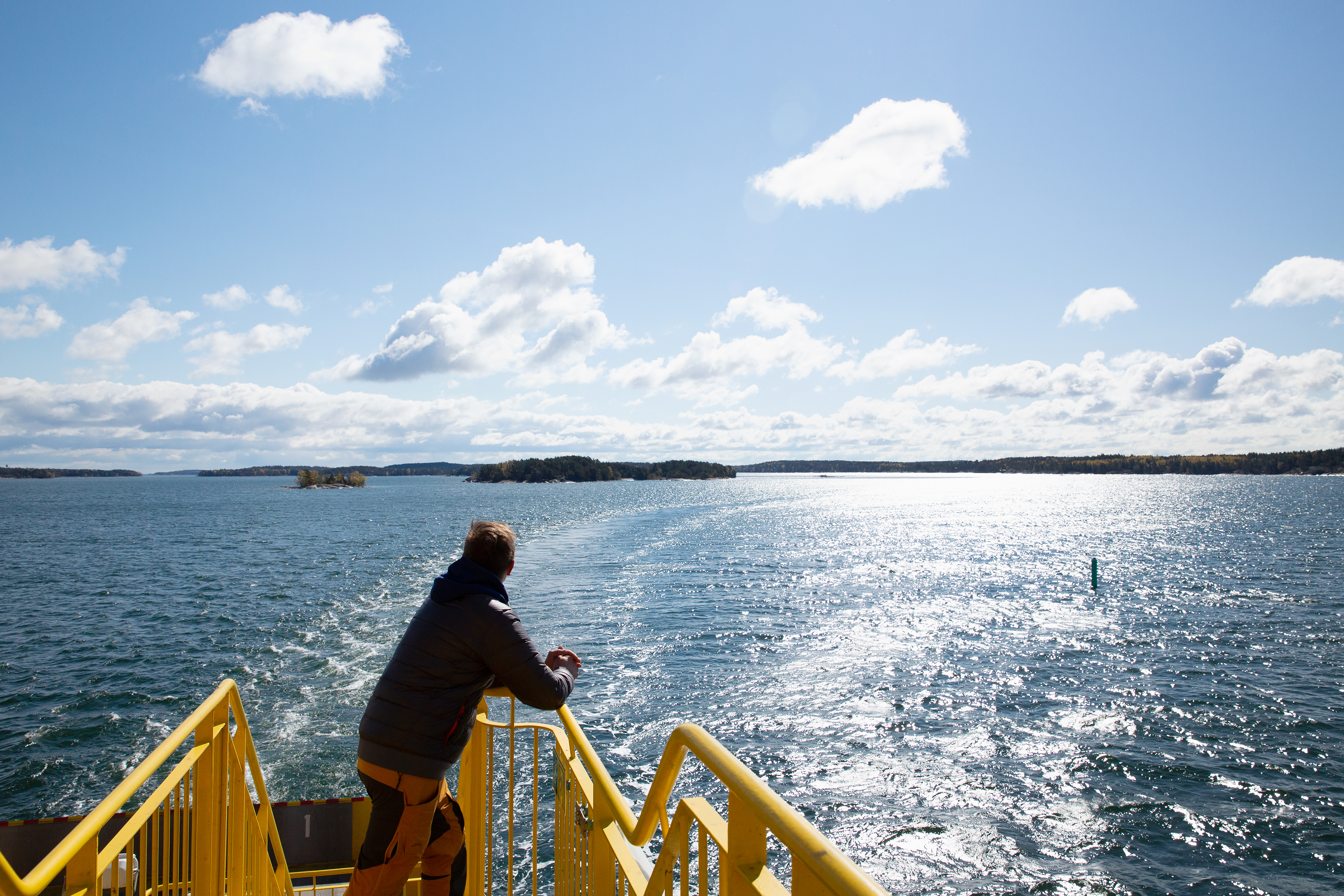 Man på gul färja till Houtskär en solig vårdag.